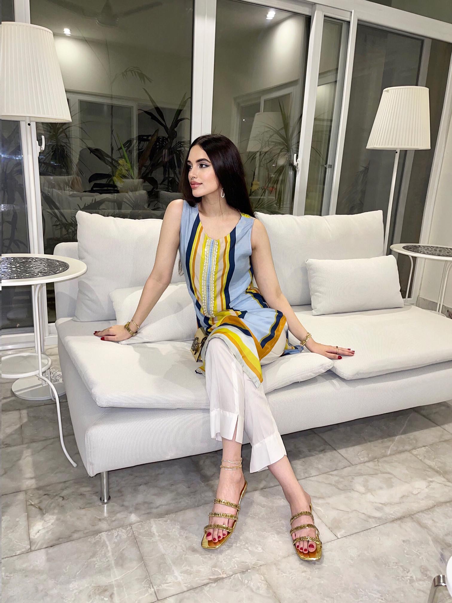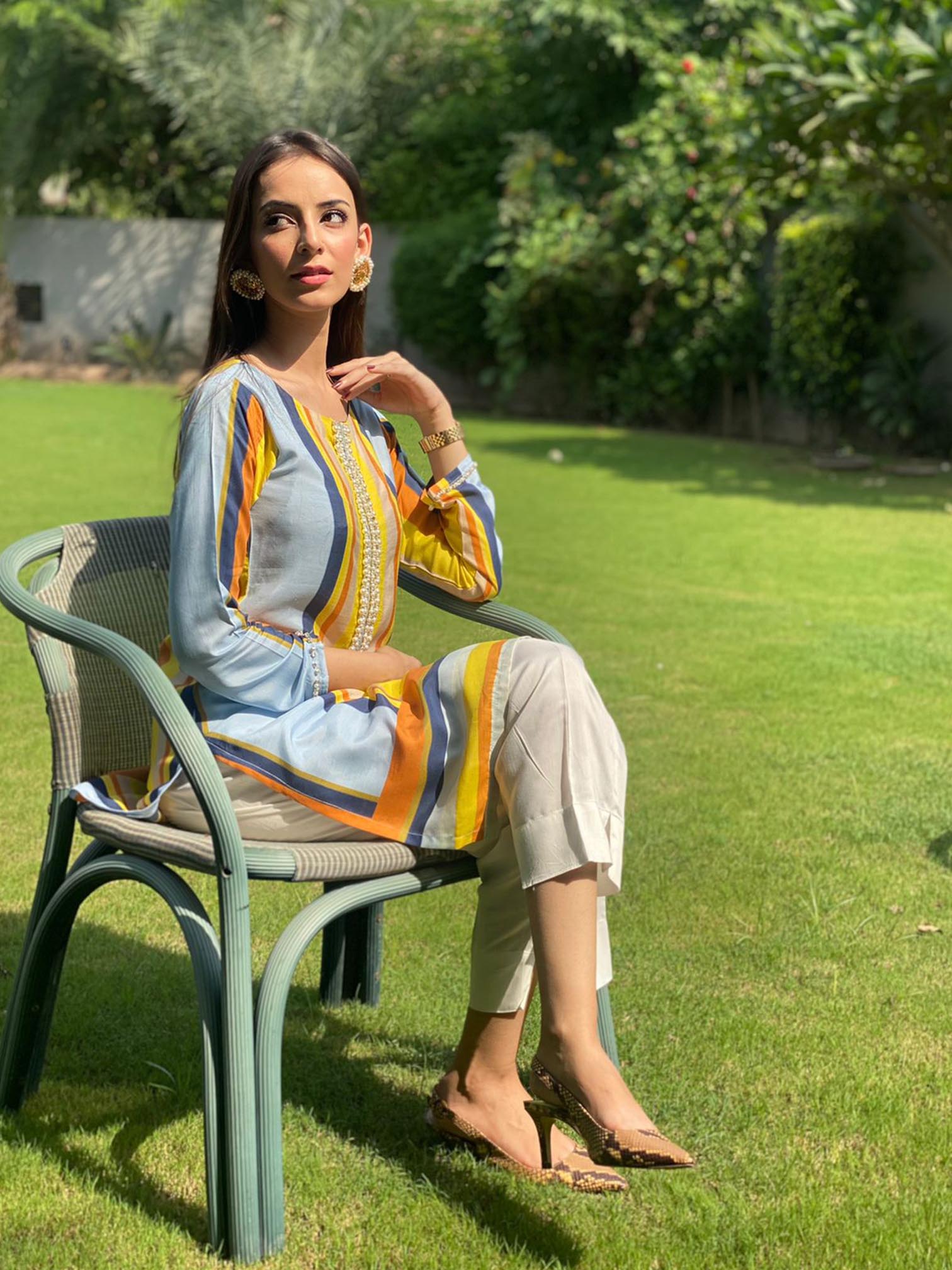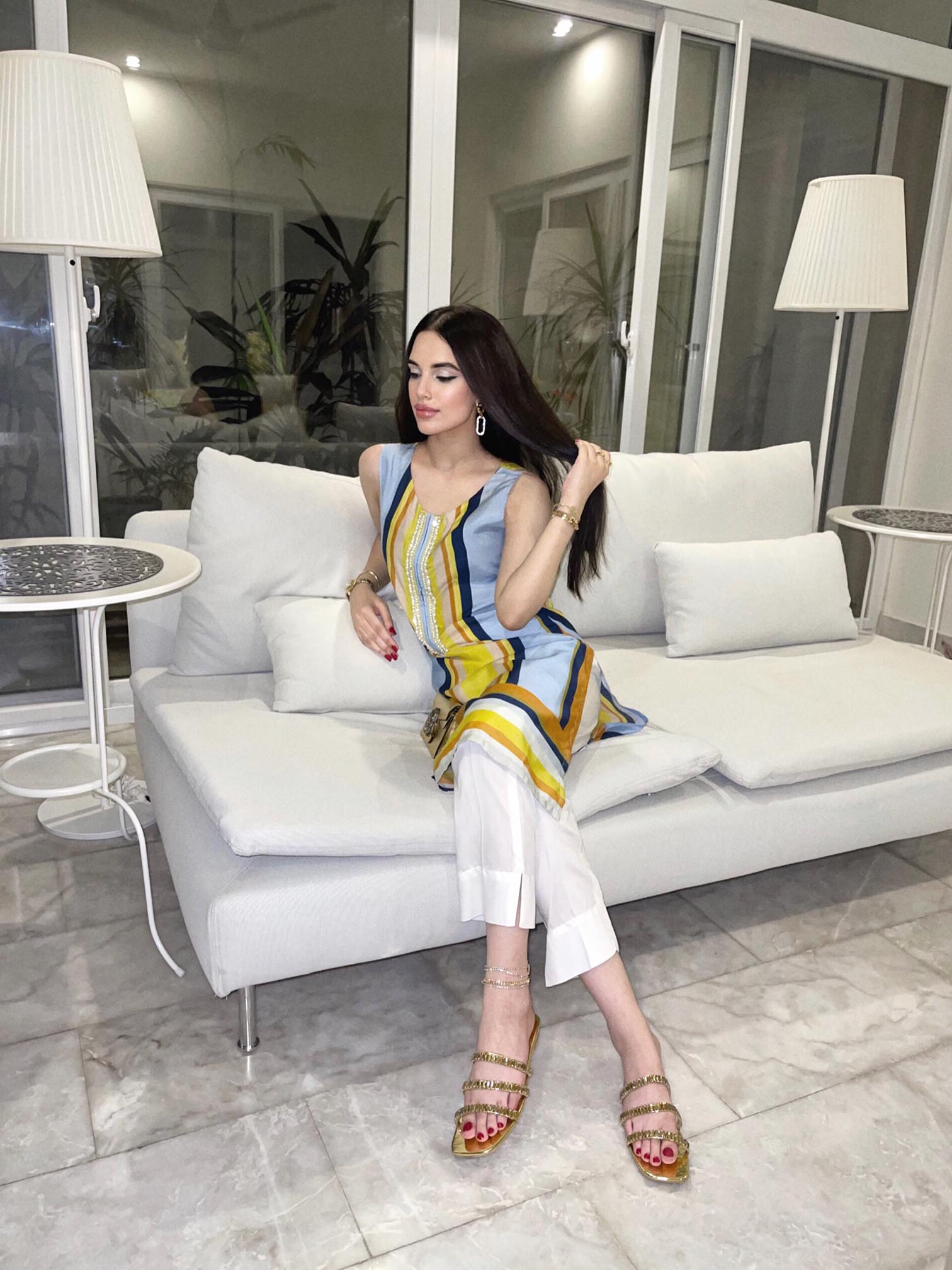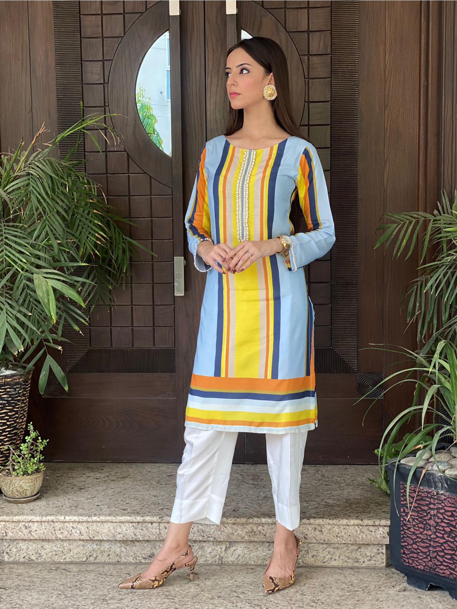 This is our classy striped print shirt with hand embellished pearls and diamantes on the neck and sleeves.